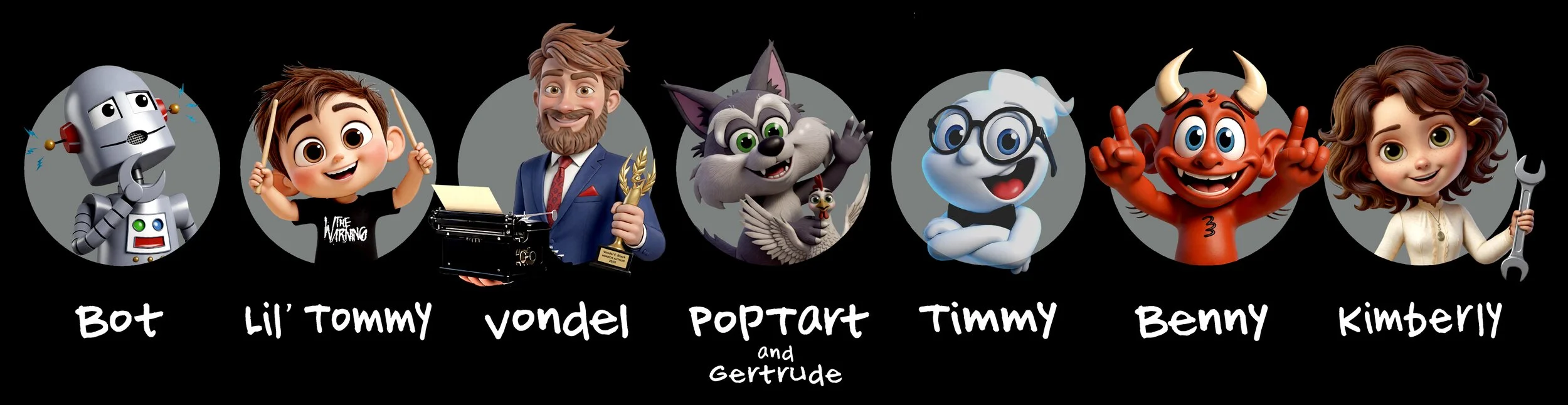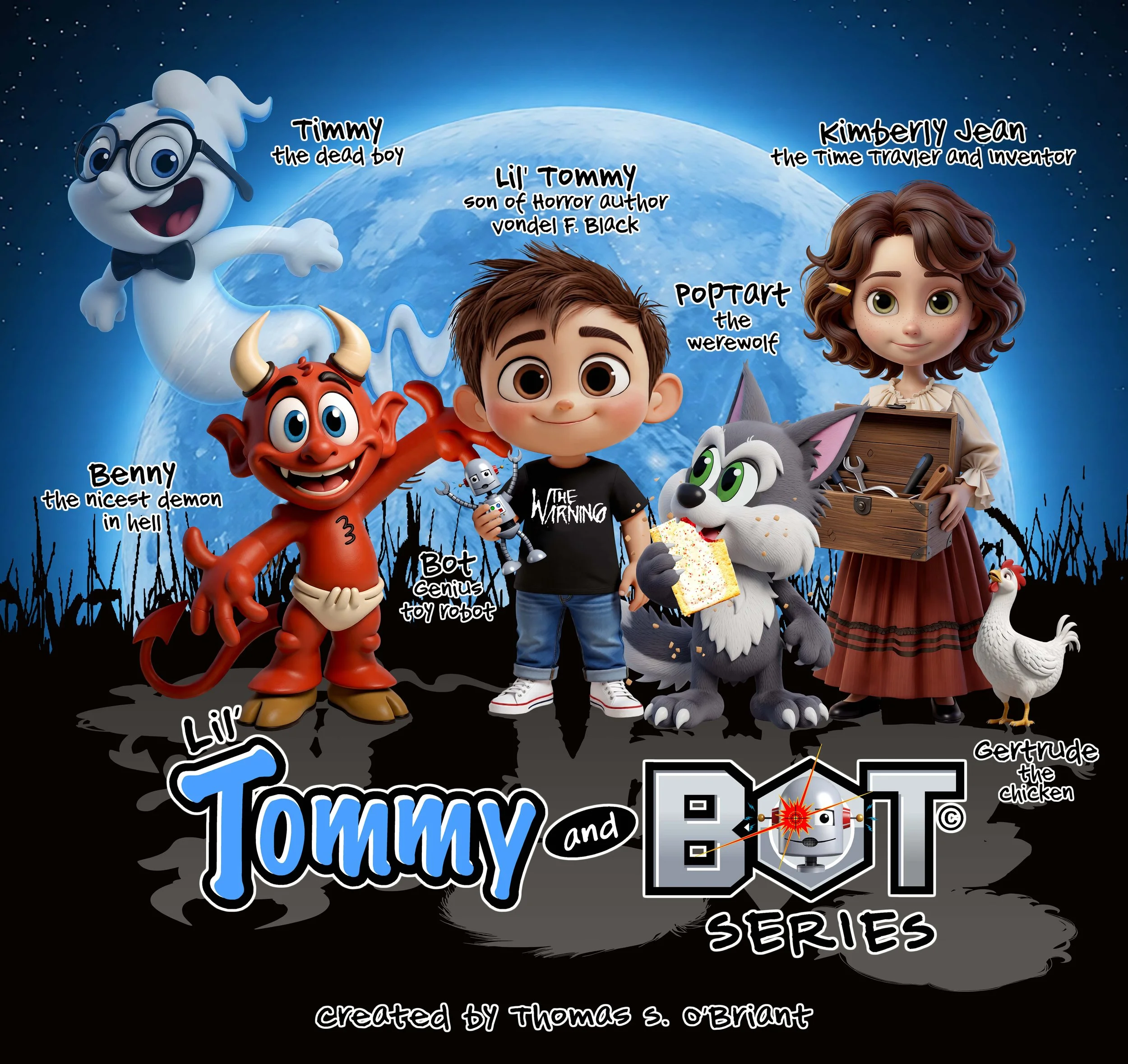 Unexplainably, Lil’ Tommy’s stories manifested in reality. Bot became sentient, equipped with a quantum synthetic brain rivaling the world’s fastest processors. Since then, other characters he created have appeared as well, including Benny, the nicest demon in hell; PopTart the werewolf and his pet chicken Gertrude; Timmy the Dead Boy; and Kimberly Jean, a time traveler and inventor. Lil’ Tommy does not know whether their existence is tied to his imagination or the typewriter—only that he wrote the stories, and they arrived at his home.